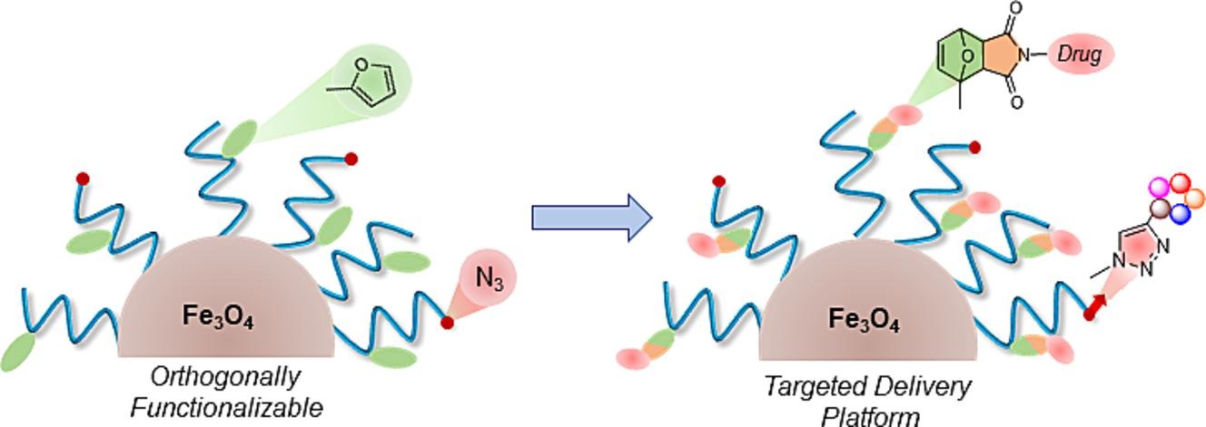 Polymer Brush-Coated Magnetic Nanoparticles: Diels-Alder/Retro-Diels-Alder Chemistry-Mediated Dual Functionalization for Targeted Drug Delivery